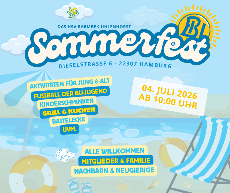 Am Sa. den 04.07.2026 laden wir euch herzlich zu unserem Sommerfest 2026 (ab 10:00 Uhr) ins und ans BU Stadion an der Dieselstraße ein. Freut euch auf einen tollen Tag für Groß & Klein mit Spielen, Vereinsangeboten sowie Speisen & Getränken. Auch Nichtmitglieder und Nachbarn sind herzlich Willkommen!